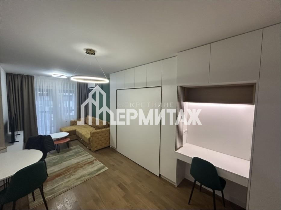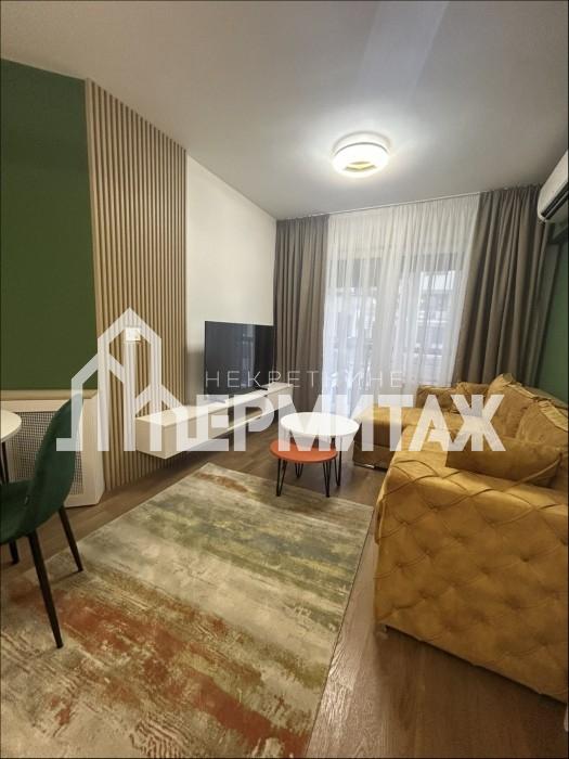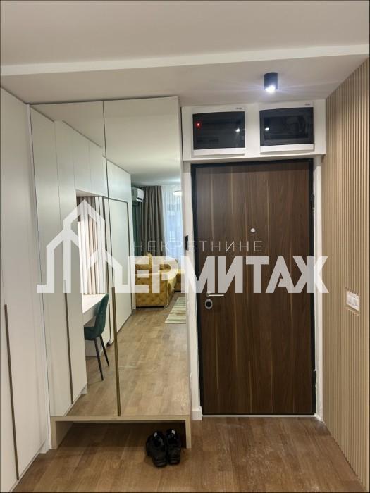 Enterijer je pažljivo osmišljen i maksimalno funkcionalan. Prostrana dnevna soba povezana je sa trpezarijskim delom i moderno opremljenom kuhinjom. Pored udobne garniture na razvlačenje, stan poseduje i veliki bračni krevet diskretno integrisan u garderober. Za one koji rade od kuće obezbeđen je praktičan radni sto, takođe uklopljen u ormarski prostor.