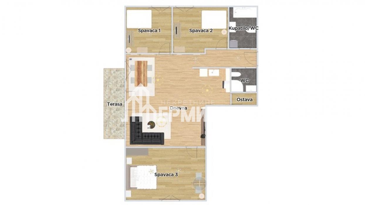 Struktura stana je sledeća: dnevni boravak sa kuhinjom i trpezarijom, tri spavaće sove, hodnik, dva kupatila, toalet, ostava i terasa.